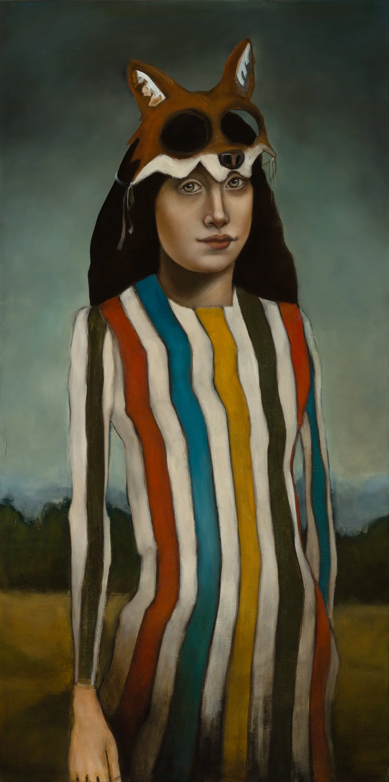 faces placed within loosely interpreted animal shapes and costumes narrate a continued thesis of dichotomy